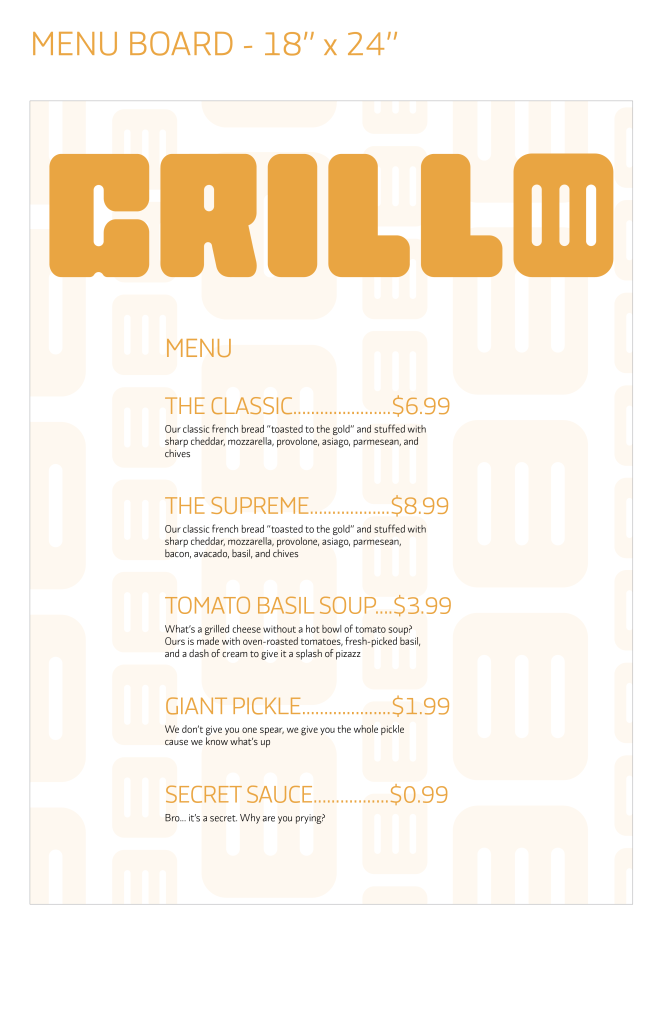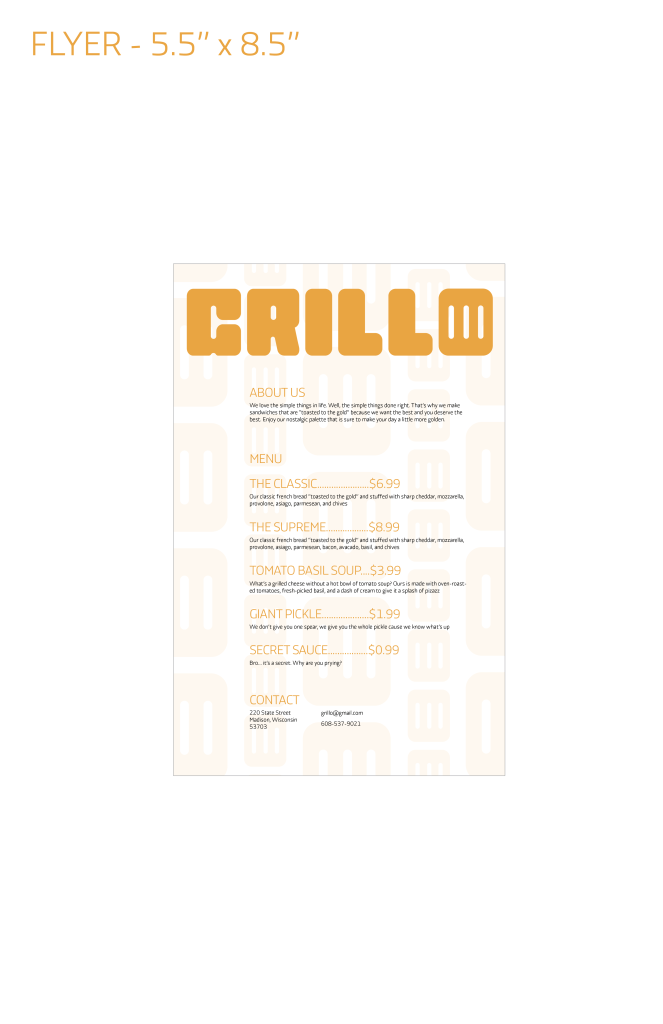 This project asked me to create branding materials for an original food truck. Grillo is a grilled cheese and tomato soup food truck that incorporates branding that is “toasted for the gold.”